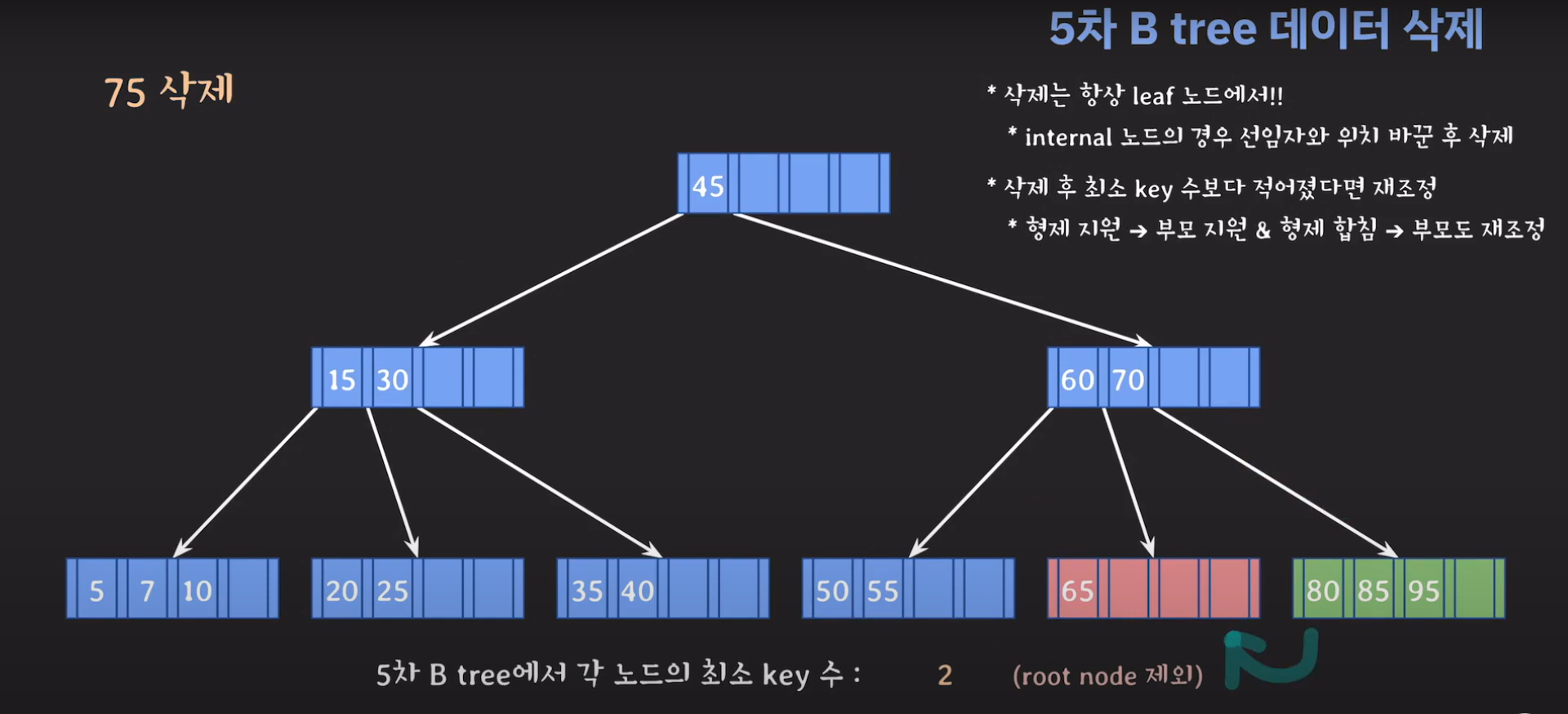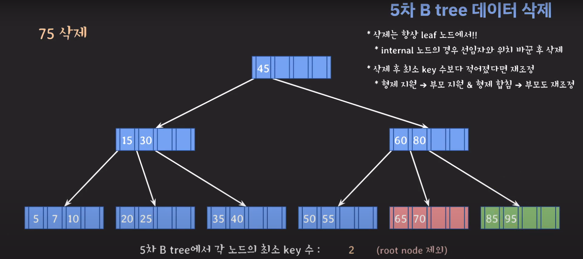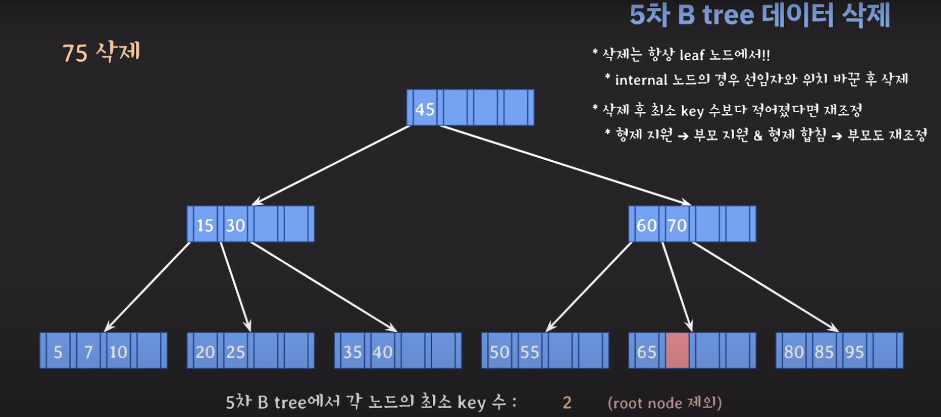 75를 삭제하고 보니까 key가 한 개이며 최소 2개의 키를 가지고 있어야 하는 조건을 만족하지 못합니다.