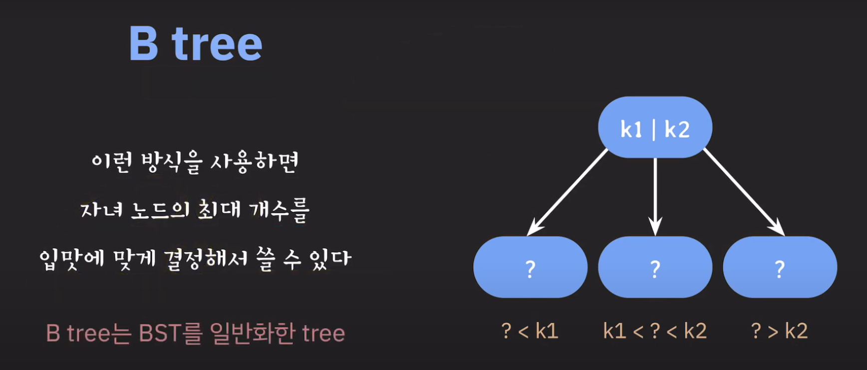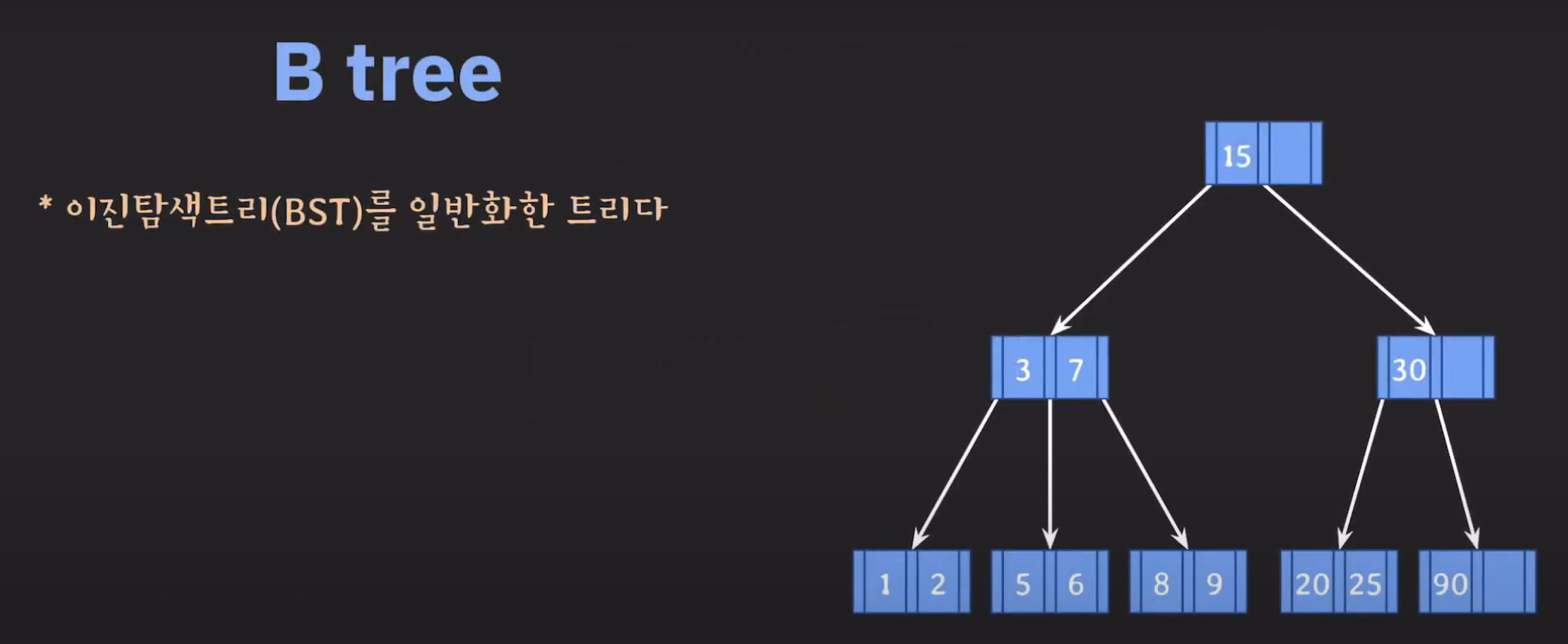 따라서 이와 같은 특징을 갖는 Tree를 B Tree라고 합니다.