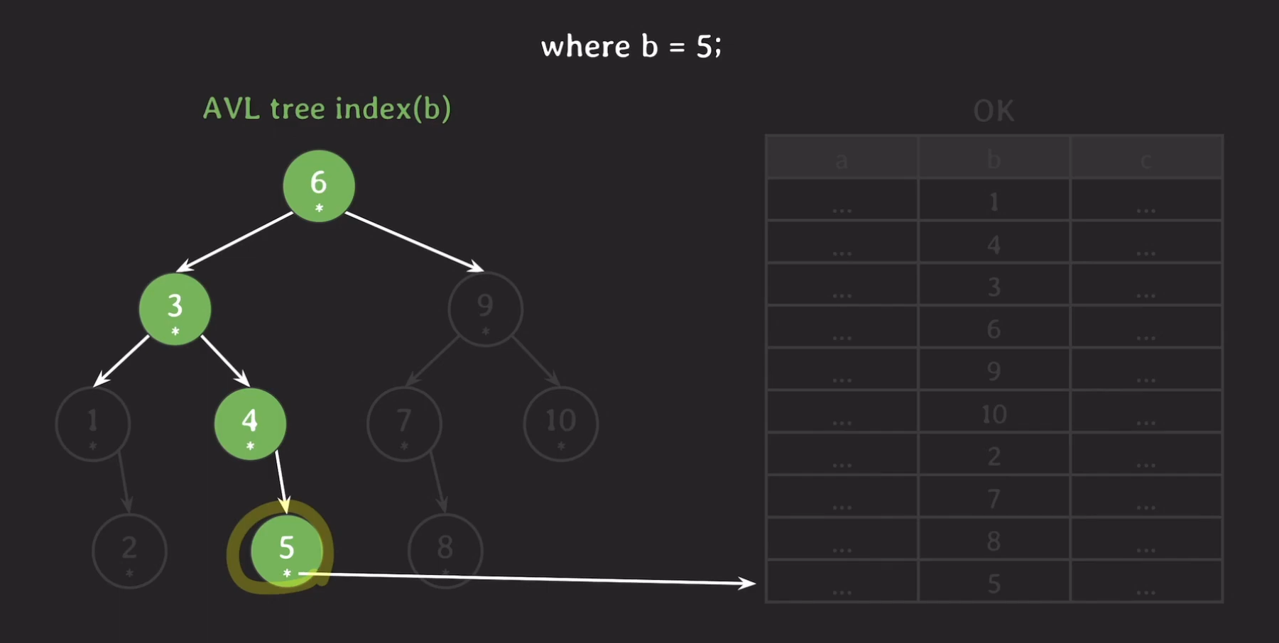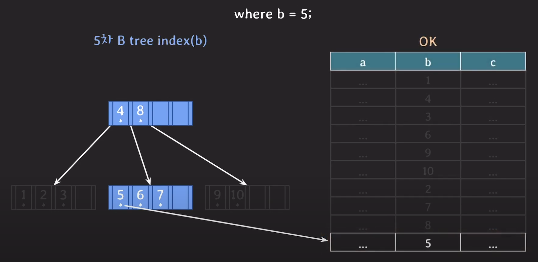 5는 4와 8 사이의 값이므로 중간에 있는 서브트리로 가고 Secondary Storage로 부터 데이터를 읽어옵니다.