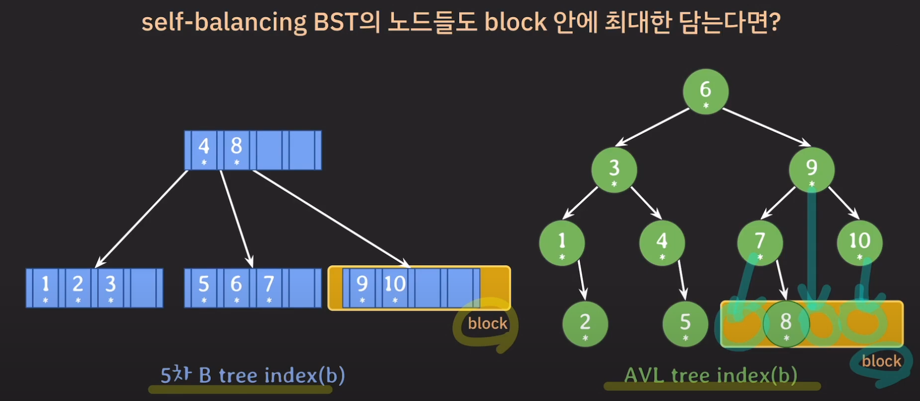 이런 고민을 할 수 있는데 이는 결국 B tree가 동작하는 방식이므로 굳이 밸런스 트리의 데이터를 한 block안에 담으려고 노력하지 말고 B tree를 사용하면 됩니다.