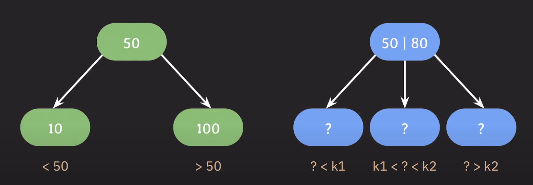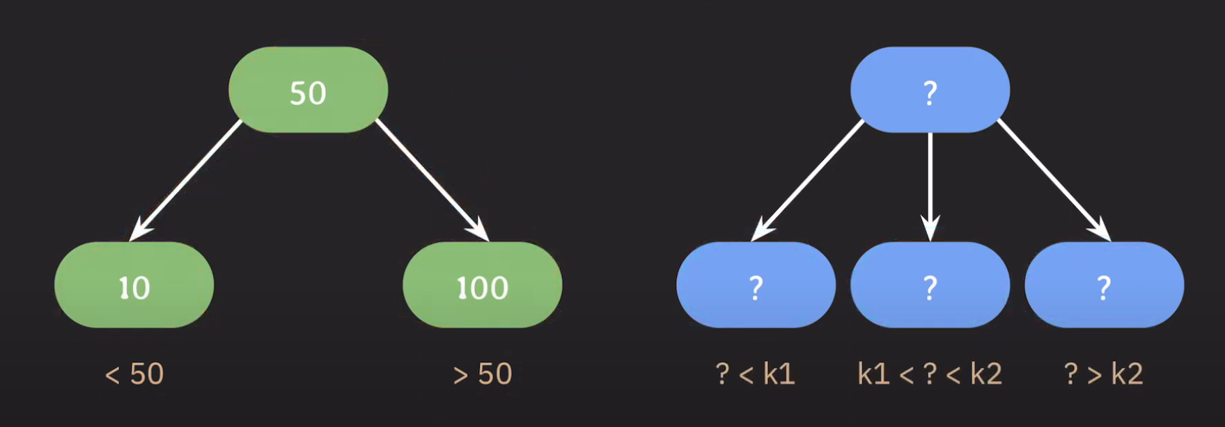 왼쪽 자녀 노드들은 부모 노드보다 작은 값으로, 오른쪽 자녀 노드들은 부모 노드보다 큰 값으로 정했던 것처럼 특정한 두 값을 기준으로 범위를 나눠 적용하면 될 것입니다.
