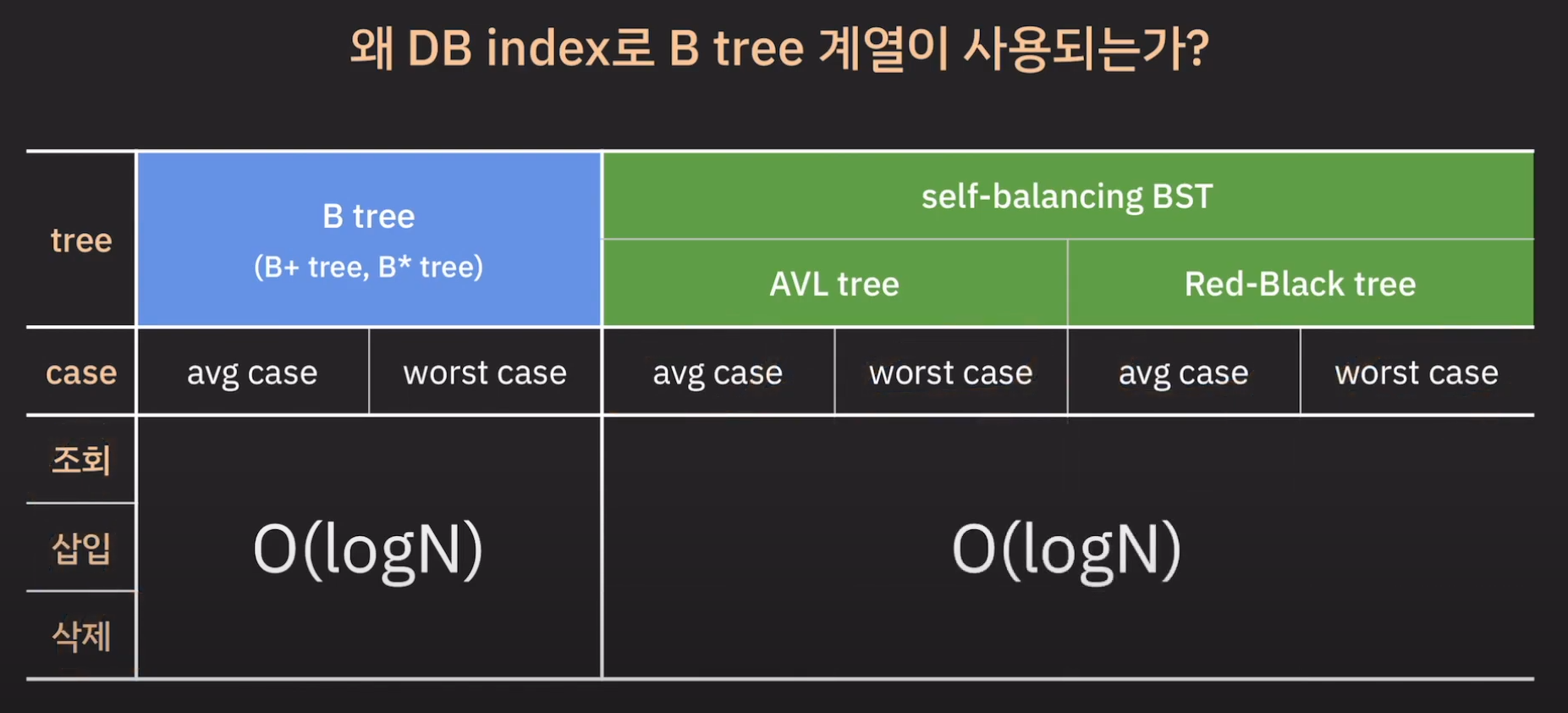 B tree, AVL Tree, Red-Black Tree 모두 시간 복잡도가 O(logN)인데 왜 B tree를 index의 자료구조로 사용하는 것일까요?