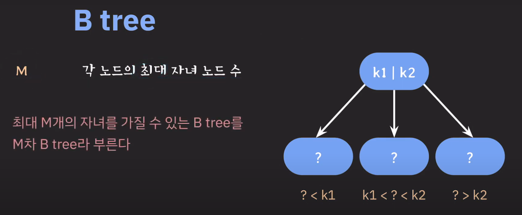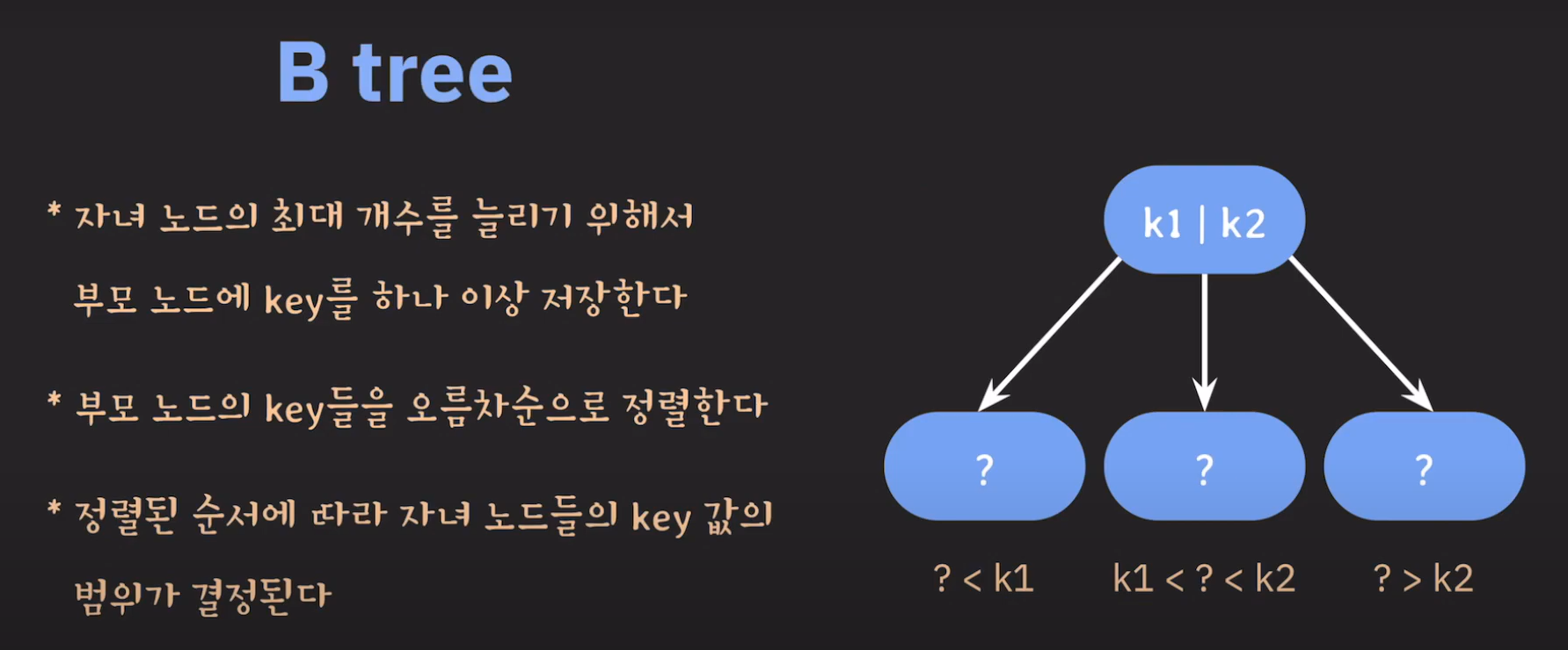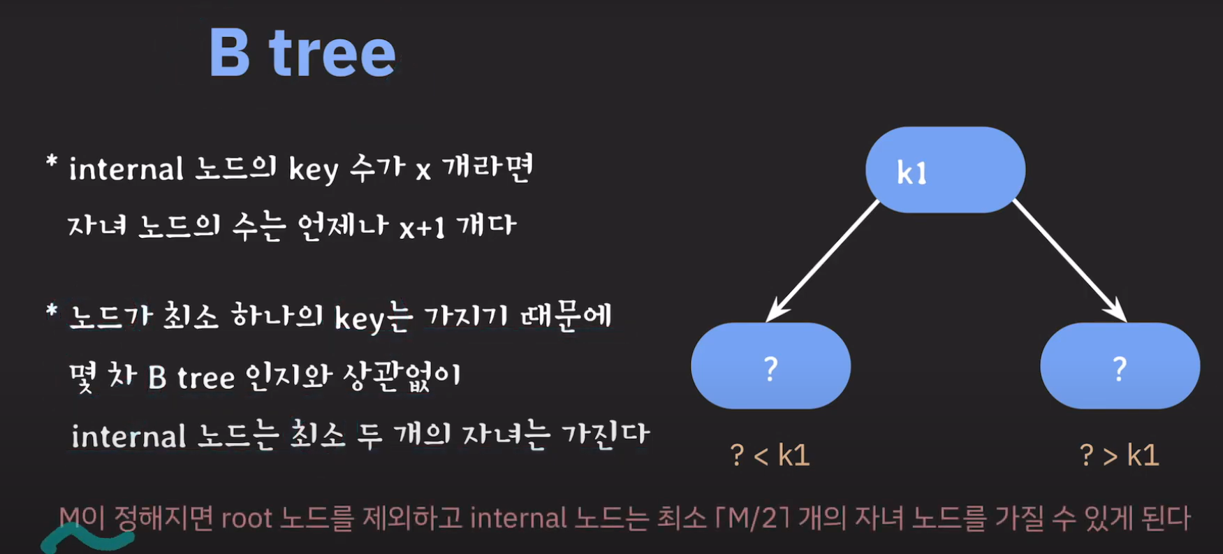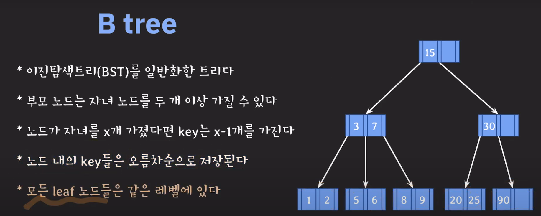 정리하면 B Tree는 다음과 같은 성질을 갖습니다.