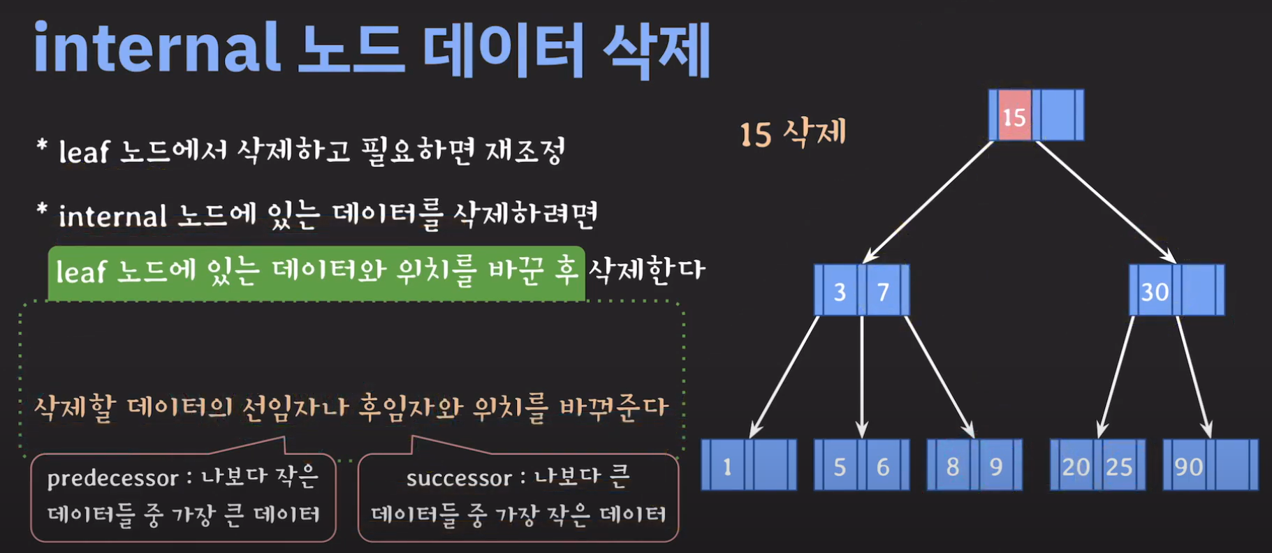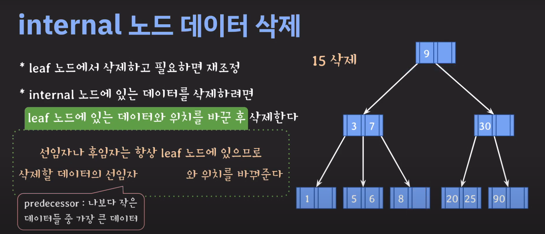 트리의 가장 큰 값은 오른쪽으로 계속 이동해야 나올겁니다. (Binary Tree 특징) 따라서 선임자의 경우 왼쪽 서브트리로 이동후 계속 오른쪽 노드로 이동해서 리프노드까지 도달 할 경우 선임자인것 을 알 수 있습니다.
