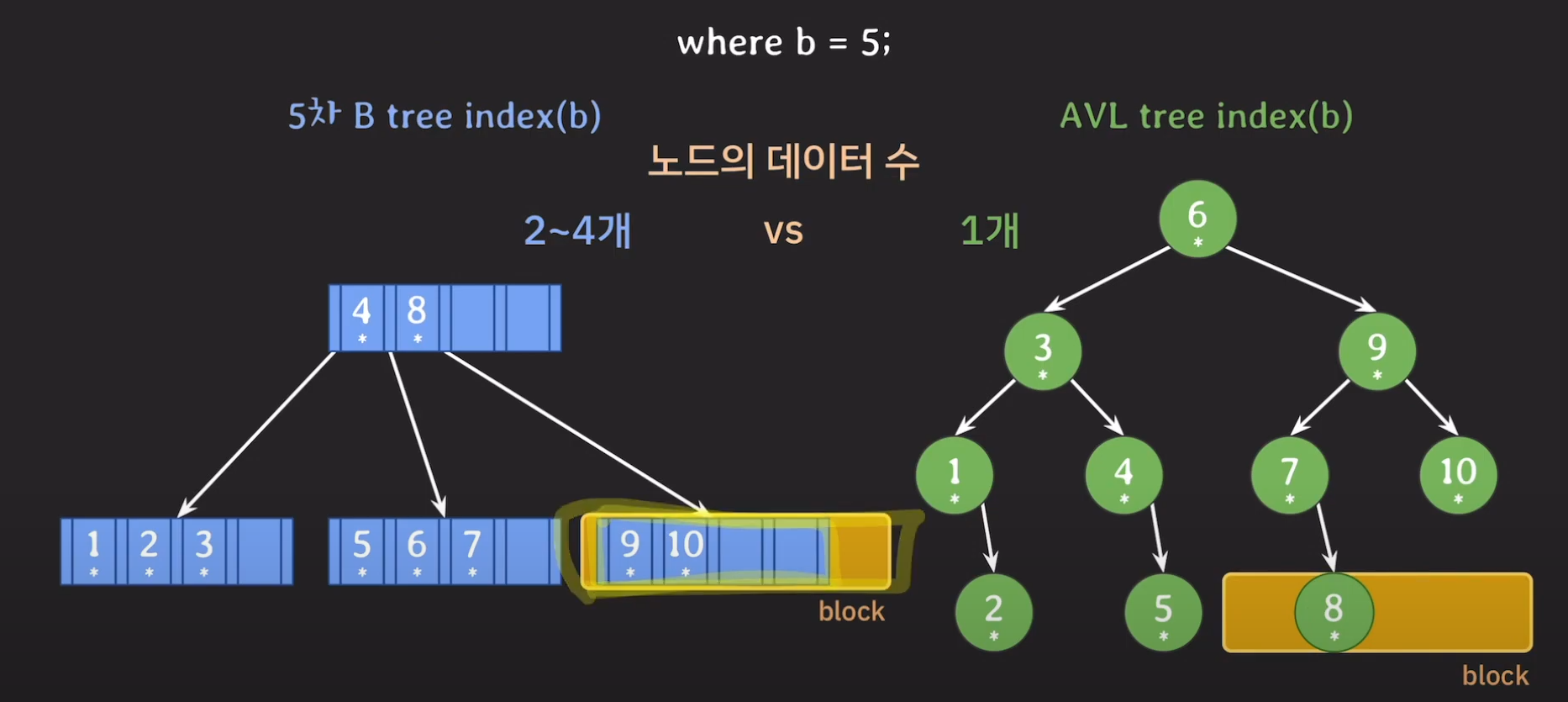 결과적으로 B tree가 AVL tree에 비해 탐색 범위를 빠르게 좁힐 수 있습니다.