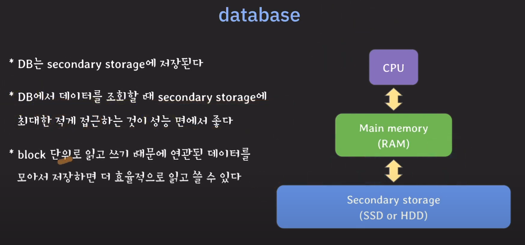 DB는 기본적으로 Secondary Storage에 저장하므로 최소한으로 접근하는 것이 성능상으로 유리합니다.