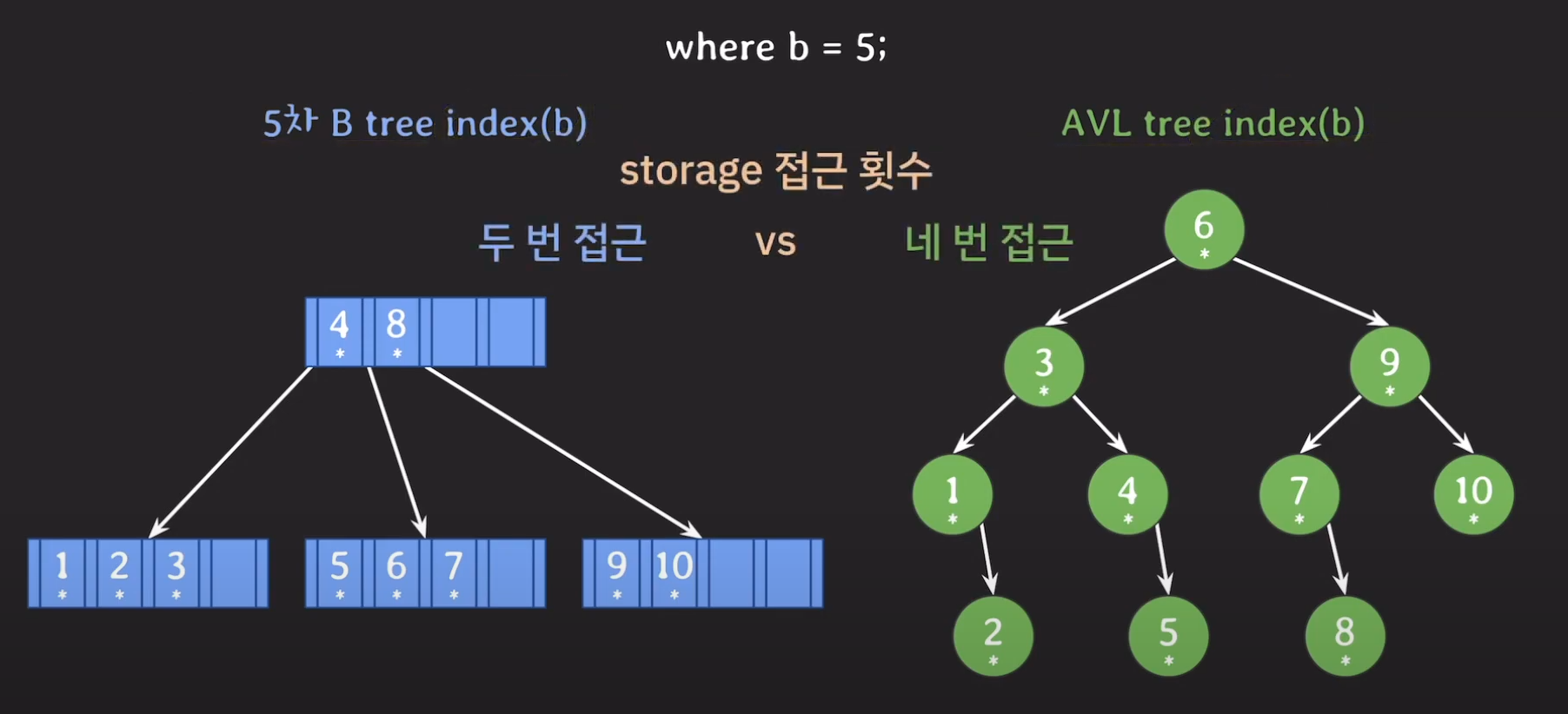 최종 비교를 해보면 B tree 기반의 인덱스가 Secondary Storage에 더 적게 접근하였으므로 속도가 더 빠르다는 것을 알 수 있게 됩니다.