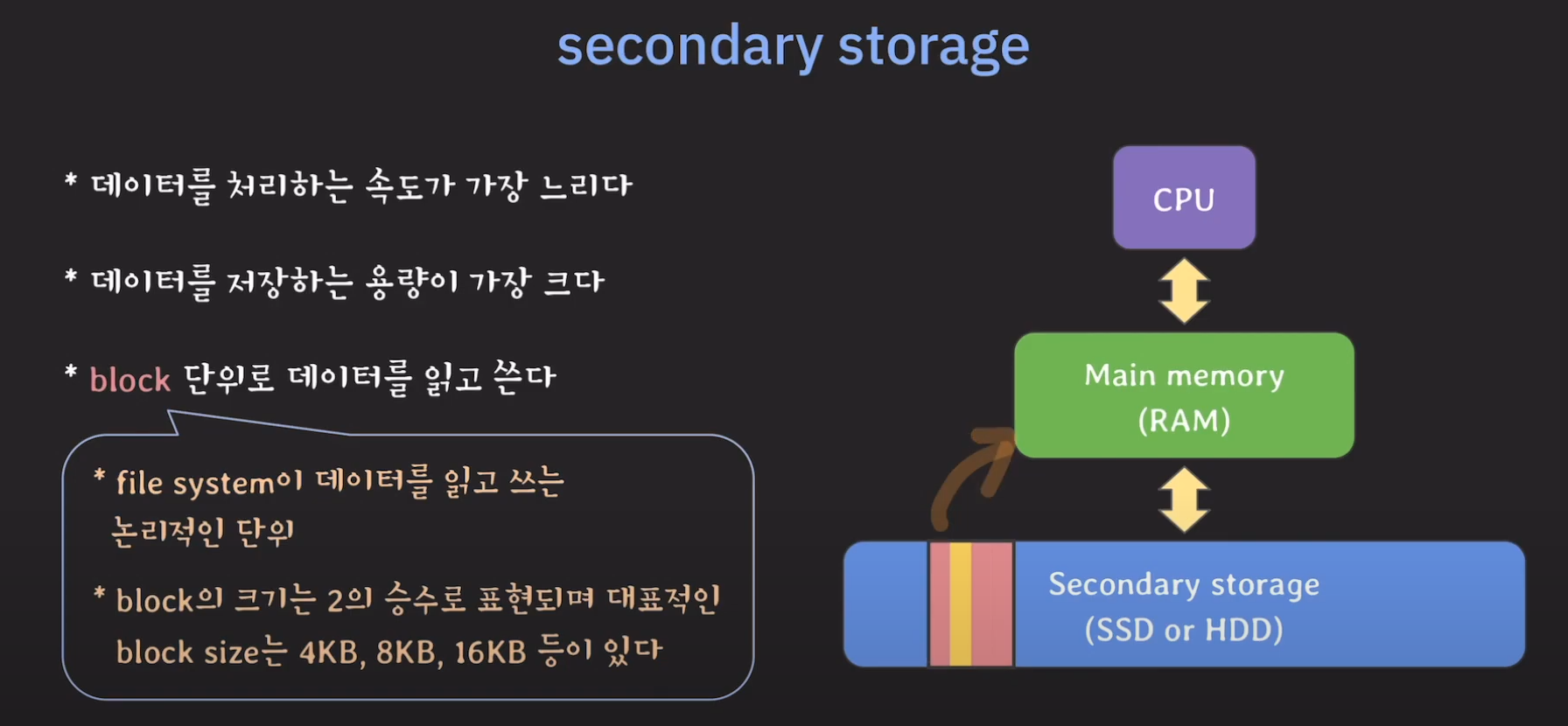 우리는 Secondary Storage에서 데이터를 block 단위로 읽어오는 것을 알고 있습니다.