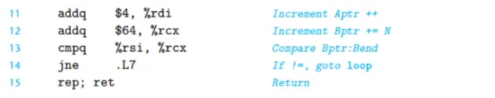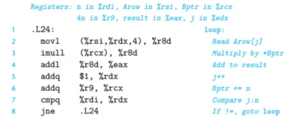 A의 i번째 행을 따라가는 포인터 Arow를 사용합니다. (j가 증가함에 따라 Arow도 하나씩 증가)B의 k번째 열을 따라가는 포인터 Bptr을 사용합니다. (j가 증가함에 따라 Bptr은 n칸씩 건너뜀)어셈블리어 코드: 최적화된 C 코드의 동작을 보여줍니다.
