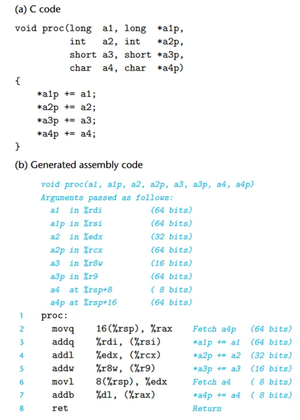 my_func(long a, int b);a는 %rdi 레지스터에 저장됩니다.b는 %esi 레지스터에 저장됩니다.함수에 전달할 인자가 6개를 초과할 경우, 7번째 인자부터는 스택을 통해 전달됩니다.