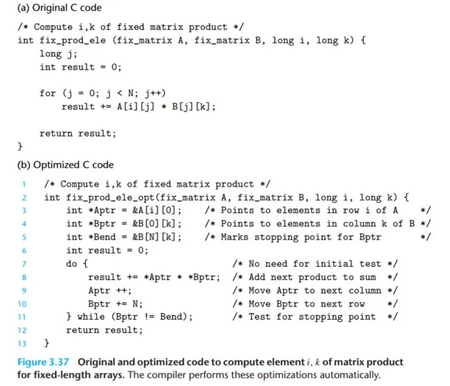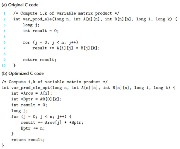 아래는 두 가변 크기 행렬의 곱셈 결과 중 한 요소를 계산하는 C 코드와, 컴파일러가 최적화한 코드, 그리고 실제 어셈블리어 코드입니다.