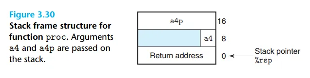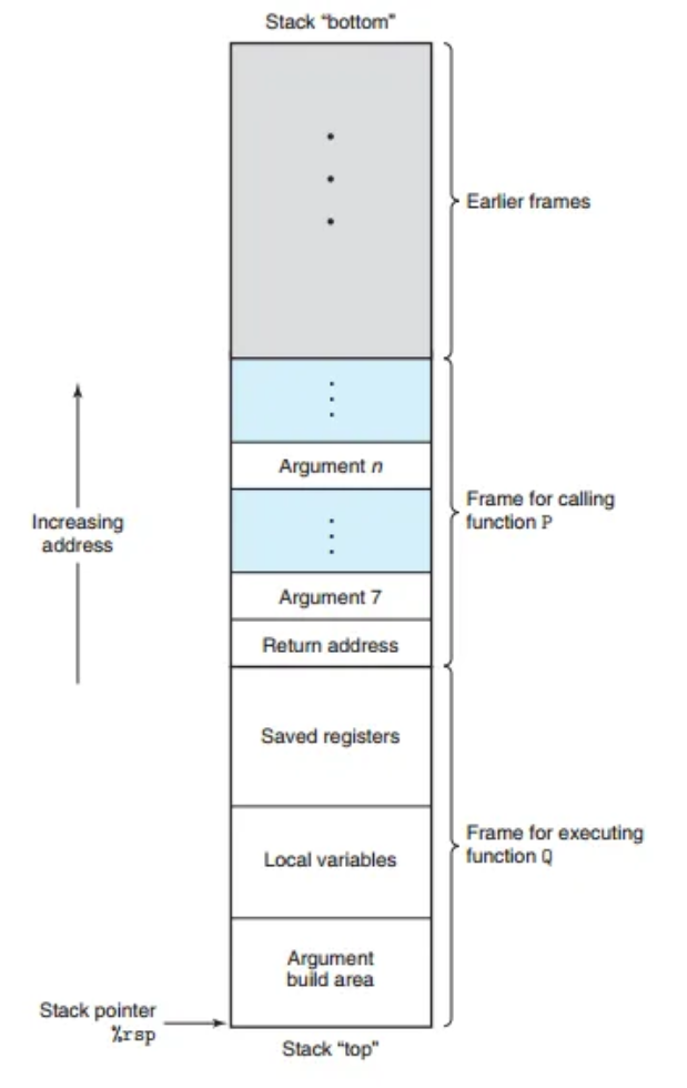 %rsp)를 아래로(낮은 주소로) 이동시켜 공간을 확보합니다.x86-64 프로시저는 시간과 공간의 효율성을 위해 자신에게 필요한 만큼의 스택 프레임만 할당합니다.