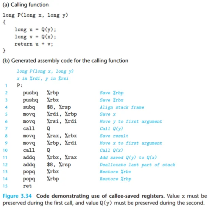 %rbx, %rbp, %r12–%r15%rsp와 피호출자 저장 레지스터를 제외한 모든 레지스터 (예: %rax, %rdi, %rsi, %rdx, %rcx, %r8–%r11)call을 하기 전에 그 값을 스택에 저장하는 등의 방법으로 백업해야 할 책임이 있습니다.long P(long x, long y) {