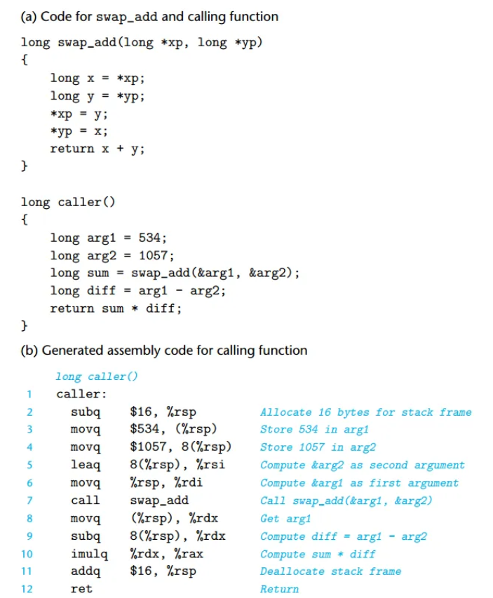 caller 함수는 시작하자마자 스택 포인터를 16만큼 감소시켜(subq $16, %rsp), arg1과 arg2(각각 8바이트)를 저장할 공간을 자신의 스택 프레임에 마련합니다.arg1과 arg2의 값을 스택에 저장합니다. (movq $534, (%rsp))leaq 명령어를 사용하여 스택에 저장된 변수들의 주소를 계산하고, 이 주소들을 레지스터(%rdi, %rsi)에 넣어 swap_add 함수를 호출합니다.addq $16, %rsp) 할당했던 공간을 해제합니다.