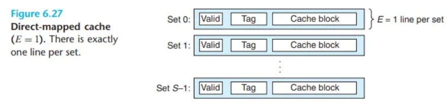 캐시는 세트당 캐시 라인의 개수(E)에 따라 여러 종류로 나뉩니다. 세트당 단 하나의 라인(E=1)만을 갖는 캐시를 직접 매핑 캐시(direct-mapped cache)라고 합니다.