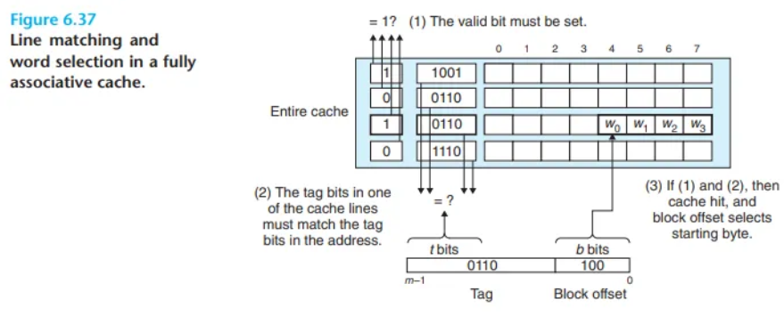 완전 연관 캐시에서의 라인 일치 확인과 워드 선택 과정은 세트 연관 캐시와 동일한 방식으로 동작합니다. 주된 차이점은 규모(scale)의 문제입니다.