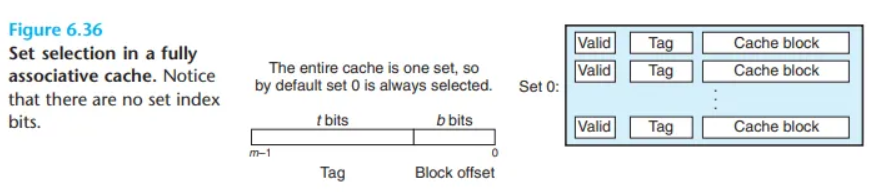 완전 연관 캐시에서의 세트 선택 과정은 매우 간단하고 자명합니다(trivial). 왜냐하면 캐시 전체가 단 하나의 세트로 이루어져 있기 때문입니다.
