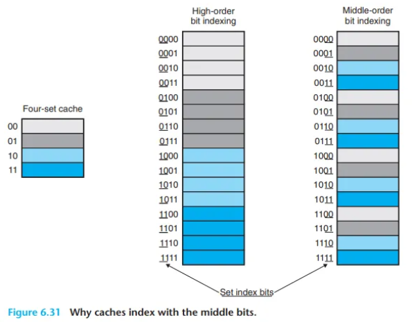 사용자는 왜 캐시가 주소의 상위 비트(high-order bits) 대신 중간 비트(middle bits)를 세트 인덱스로 사용하는지 궁금할 수 있습니다. 여기에는 중간 비트를 사용하는 것이 더 나은 합당한 이유가 있습니다.