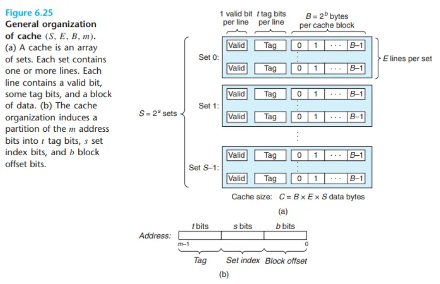 m비트의 메모리 주소를 사용하는 컴퓨터 시스템(즉, M=개의 고유한 주소를 가짐)을 가정해 봅시다. 이러한 시스템을 위한 캐시는 다음과 같이 구성됩니다.