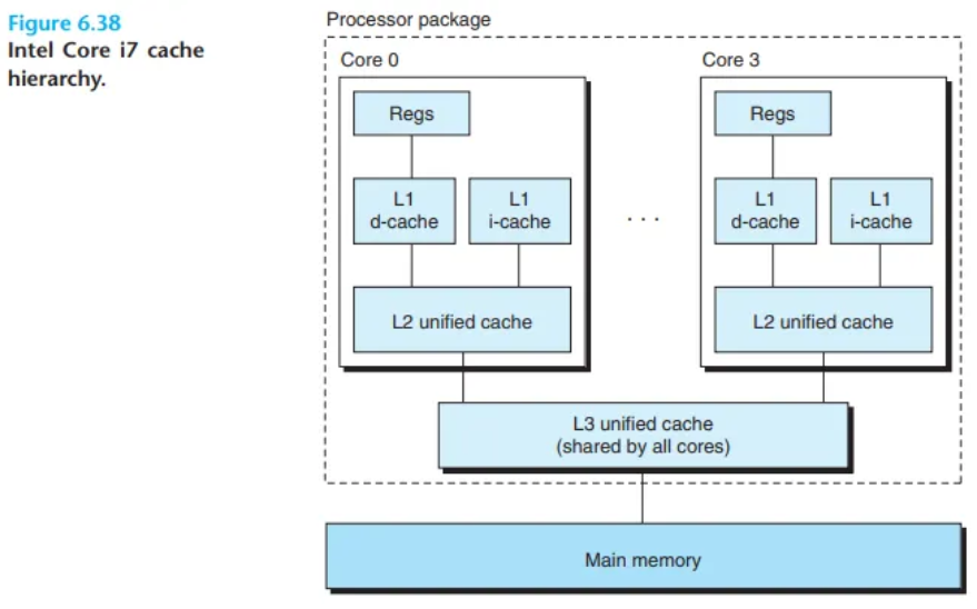 본문 그림 6.38은 Intel Core i7 프로세서의 캐시 계층 구조를 보여줍니다.