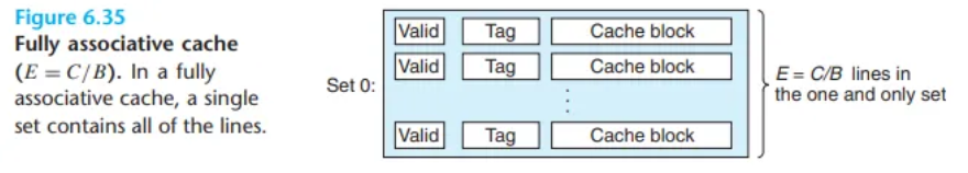완전 연관 캐시는 세트 연관 캐시의 가장 극단적인 형태로, 단 하나의 세트(set)가 캐시의 모든 라인을 포함하는 구조입니다. 즉, E = C/B 인 경우를 말합니다. (E: 세트당 라인 수, C: 캐시 전체 크기, B: 블록 크기)