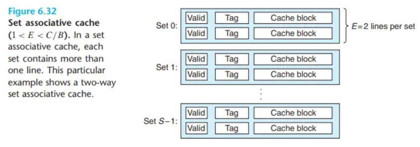 1 < E < C/B 조건을 만족하는 캐시를 일반적으로 E-way 세트 연관 캐시(E-way set associative cache)라고 부릅니다. (여기서 C는 캐시 크기, B는 블록 크기입니다.)E = C/B가 되는 극단적인 경우(완전 연관 캐시)는 다음 섹션에서 다룹니다.
