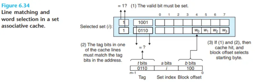 여기서 중요한 아이디어는, 해당 세트로 매핑되는 모든 메모리 블록은 그 세트 안의 어떤 라인에든(any line) 위치할 수 있다는 점입니다. 따라서 캐시는 반드시 세트 내의 각 라인을 모두 검색하여, 유효 비트가 1이고 태그가 주소의 태그와 일치하는 라인이 있는지 찾아야 합니다. 만약 그런 라인을 찾으면, 캐시 히트(cache hit)가 발생합니다.