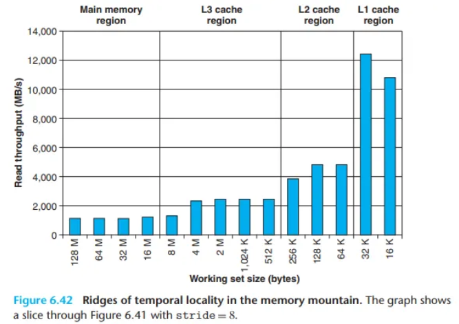 stride가 증가하고 공간적 지역성이 감소함에 따라 내리막길을 형성하는 경사(slope)가 존재합니다. 작업 집합이 너무 커서 어떤 캐시에도 들어가지 못하는 경우에도, 메인 메모리 능선의 가장 높은 지점은 가장 낮은 지점보다 8배나 더 높습니다. 이는 프로그램의 시간적 지역성이 나쁘더라도, 공간적 지역성만으로도 여전히 상당한 성능 차이를 만들 수 있음을 의미합니다.