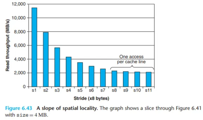- 공간적 지역성의 영향 (그림 6.43): 작업 집합 크기를 4MB로 고정하고