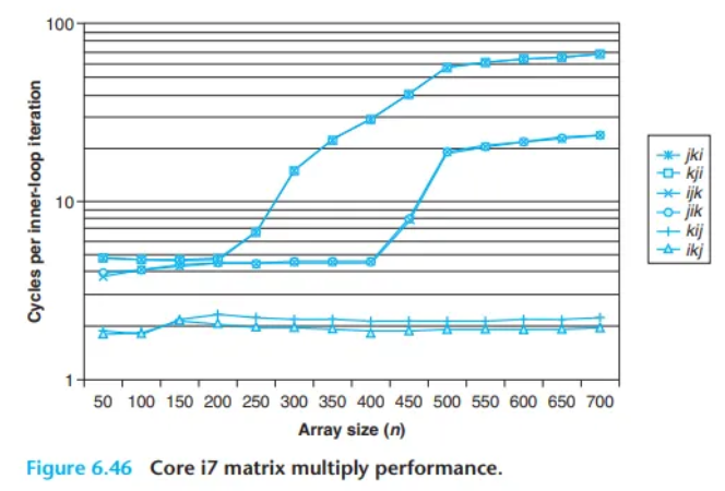 n 값에 대해, 가장 빠른 버전(kij, ikj)은 가장 느린 버전(jki, kji)보다 거의 40배 더 빠르게 실행됩니다. 두 버전이 동일한 수의 부동소수점 연산을 수행함에도 불구하고 말입니다.