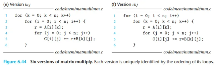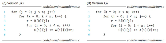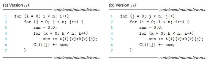 이번에는 n x n 행렬 쌍의 곱셈 C = AB 문제를 고려해 봅시다. 행렬 곱셈 함수는 보통 i, j, k 인덱스를 사용하는 3중 중첩 루프로 구현됩니다. 이 루프들의 순서를 바꾸고 약간의 코드 변경을 가하면, 기능적으로 동일한 6가지 버전의 행렬 곱셈 함수를 만들 수 있습니다. 각 버전은 루프의 순서에 따라 고유하게 식별됩니다.