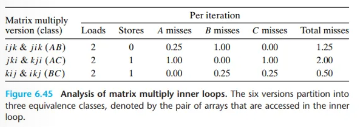 겉보기에는 6가지 버전이 모두 매우 유사합니다. 각 버전은 O(n3)의 연산을 수행하며, 동일한 횟수의 덧셈과 곱셈을 합니다. 하지만 가장 안쪽 루프(inner loop)의 동작을 분석해 보면, 메모리 접근 횟수와 지역성 측면에서 큰 차이가 있음을 발견할 수 있습니다.