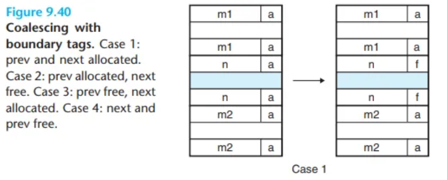 우리가 선택한 가용 리스트 형식—즉, 항상 '할당됨(allocated)'으로 표시되는 프롤로그(prologue) 블록과 에필로그(epilogue) 블록을 둔 것—은 free 하려는 블록(bp)이 힙(heap)의 맨 처음이나 맨 끝에 위치하는 까다롭고 성가신 경계 조건(edge conditions)을 무시할 수 있게 해줍니다.