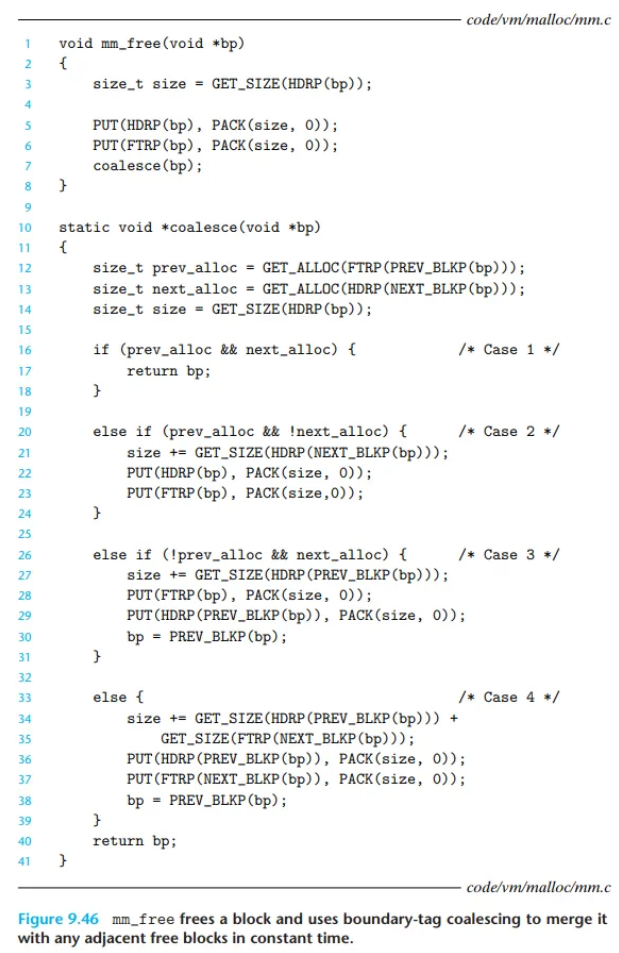 애플리케이션은 mm_free 함수(그림 9.46)를 호출하여 이전에 할당된 블록을 해제합니다. 이 함수는 요청된 블록(bp)을 해제(free)한 다음, 9.9.11절에서 설명한 경계 태그(boundary-tags) 병합 기법을 사용하여 인접한 가용 블록들을 병합합니다.