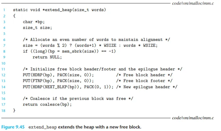 mm_init 내부에서)mm_malloc이 적절한 가용 블록을 찾지 못했을 때정렬 유지 (라인 7–9):extend_heap은 8바이트 정렬을 유지하기 위해, 요청된 크기(size)를 항상 가장 가까운 8바이트(double-word, 2워드)의 배수로 '반올림(rounds up)'합니다. 그리고 이 반올림된 크기만큼 mem_sbrk를 호출하여 힙 공간을 추가로 요청합니다.