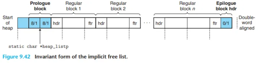 만약 이 특별한 '더미(dummy)' 블록들이 없다면, free를 요청할 때마다 매번 이 희귀한 경계 조건들(if (bp == heap_start) 등)을 확인해야 하므로, 코드가 더 지저분해지고(messier), 오류에 더 취약하며(error prone), 더 느려졌을(slower) 것입니다.