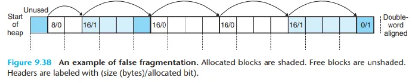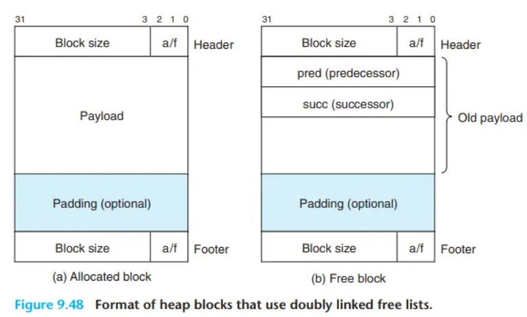 이는 최소 블록 크기(minimum block size)를 증가시키고 (예: 헤더(4) + pred(8) + succ(8) + 꼬리표(4) = 24바이트), 내부 단편화(internal fragmentation)의 가능성을 높입니다.
