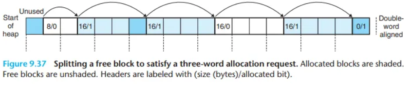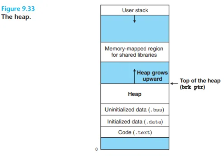 brk: 커널은 각 프로세스마다 brk("브레이크"라고 발음)라는 변수를 유지하며, 이는 힙의 최상단(top)을 가리킵니다.할당기는 힙을 다양한 크기의 블록(block) 집합으로 유지 관리합니다. 각 블록은 연속적인 가상 메모리 덩어리이며, 할당됨(allocated) 또는 가용(free) 상태 중 하나입니다.