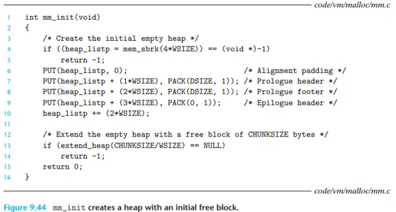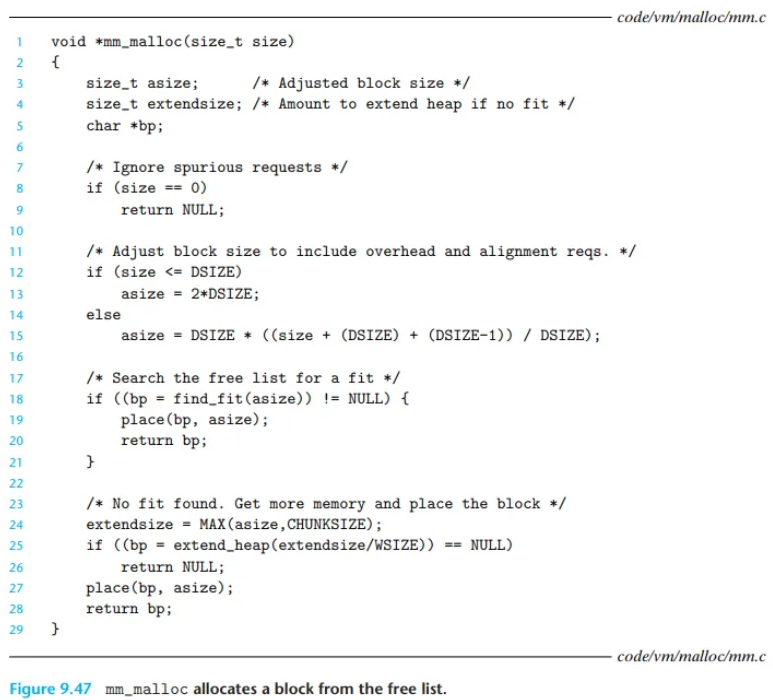애플리케이션은 mm_malloc 함수(그림 9.47)를 호출하여 size 바이트의 메모리 블록을 요청합니다.