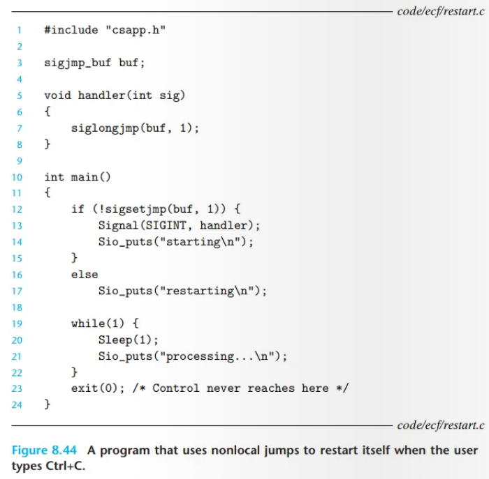 longjmp는 시그널 핸들러가 중단된 코드로 복귀하는 대신, 프로그램의 특정 지점(예: 시작점)으로 분기할 수 있게 합니다. (예: Ctrl+C로 프로그램 재시작)