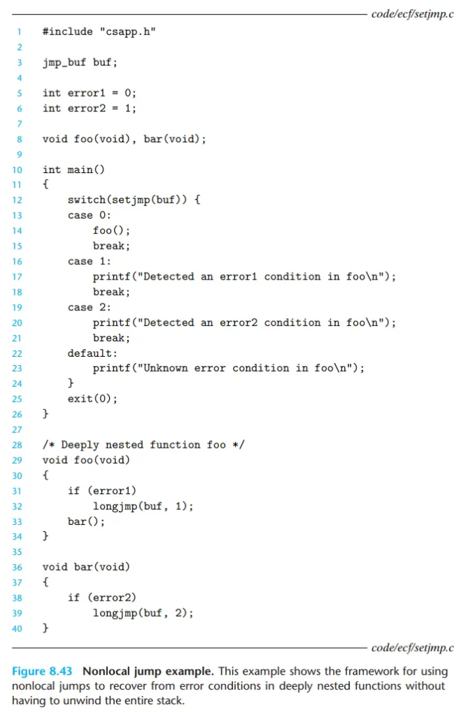 C 언어는 비지역 점프(nonlocal jump)라는 사용자 수준의 예외적 제어 흐름(ECF)을 제공합니다. 이는 일반적인 함수 호출/반환 순서를 무시하고, 한 함수에서 스택 상의 다른 (현재 실행 중인) 함수로 제어권을 직접 이전시키는 기능입니다. 이 기능은 setjmp와 longjmp 함수를 통해 제공됩니다.