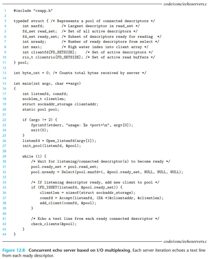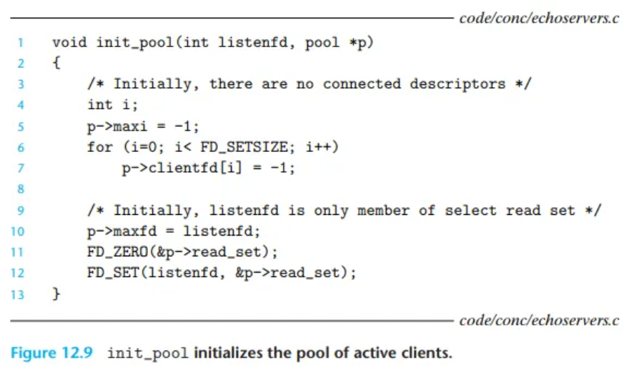 init_pool(line 27)을 호출하여 풀을 초기화합니다.select 함수를 호출하여(line 32) 두 가지 종류의 입력 이벤트를 감지합니다.listenfd가 준비됨)connfd가 준비됨)listenfd가 준비되면 (즉, 새 연결 요청이 도착하면, line 35), 서버는 연결을 수락(Accept, line 37)하고 add_client 함수를 호출하여 클라이언트를 풀에 추가합니다(line 38).check_clients 함수를 호출하여(line 42) 준비된 각 연결 디스크립터로부터 텍스트 한 줄씩 에코합니다. (이전 12.2 예제의 문제를 해결함)init_pool 함수 (Figure 12.9)