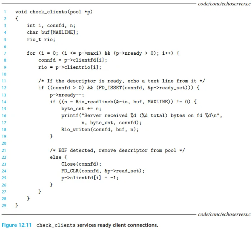 clientfd 배열에서 빈 슬롯(-1인 곳)을 찾습니다(line 5).connfd를 배열에 추가하고(line 8), rio_readlineb를 호출할 수 있도록 해당 클라이언트를 위한 Rio 읽기 버퍼를 초기화합니다(line 9).FD_SET: 새 connfd를 select의 read_set에 추가합니다(line 12). (★ 이제부터 이 클라이언트의 데이터 도착도 감시 대상이 됩니다.)maxfd (lines 15–16): select 함수에 넘겨줄 디스크립터 번호의 최댓값을 추적합니다.maxi (lines 17–18): check_clients 함수가 전체 배열을 검색할 필요 없이, 현재까지 사용된 clientfd 배열의 가장 큰 인덱스를 추적합니다. (최적화)check_clients 함수 (Figure 12.11)