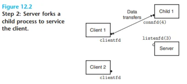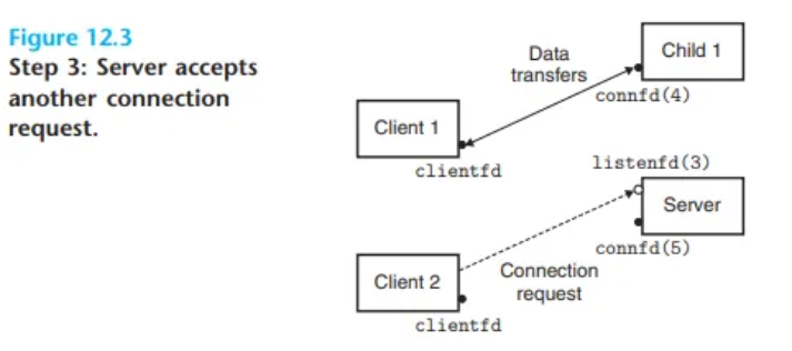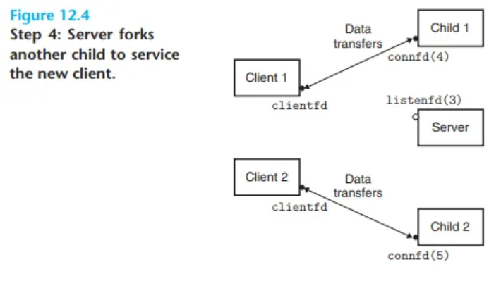 fork를 호출하여 두 번째 자식 프로세스를 생성합니다.이 시점에서 부모는 다음 연결 요청을 기다리고, 두 자식 프로세스는 각자의 클라이언트를 동시에(concurrently) 서비스하게 됩니다.