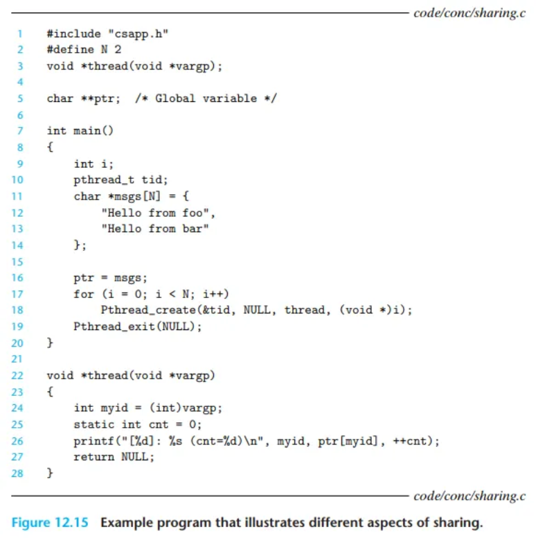 cnt (공유됨 O):cnt 변수(지역 정적 변수)는 공유됩니다. cnt는 런타임 시 단 하나의 인스턴스만 가지며, 이 인스턴스를 두 피어 스레드가 모두 참조하기 때문입니다.myid (공유 안 됨 X):myid 변수(지역 자동 변수)는 공유되지 않습니다. myid는 두 개의 인스턴스(각 스레드의 스택에 하나씩)를 가지며, 각각의 인스턴스는 정확히 하나의 스레드에 의해서만 참조되기 때문입니다.msgs (공유될 수 있음!):main 함수의 스택에 있는) msgs와 같은 지역 자동 변수(local automatic variable) 또한 공유될 수 있다는 것을 인지하는 것이 중요합니다. (이 경우, ptr이라는 전역 변수가 msgs를 가리키고, 피어 스레드들이 ptr을 통해 msgs에 접근하므로 공유됩니다.)
