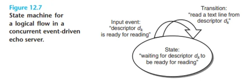 I/O 멀티플렉싱 기반의 동시성 서버는 새로운 클라이언트 마다, 새로운 상태 머신 를 생성하고 이를 연결 디스크립터 와 연결합니다. (Figure 12.7에서 설명하듯이)