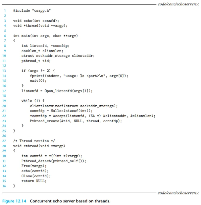 Figure 12.14는 스레드를 기반으로 하는 동시성 에코 서버의 코드입니다.
