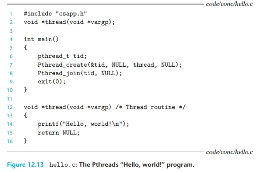 void *vargp)를 입력으로 받고, 제네릭 포인터(void *)를 반환합니다.struct에 넣고 그 struct의 포인터를 전달해야 합니다. (여러 값을 반환할 때도 마찬가지)(Lines 12-16) 피어 스레드를 위한 스레드 루틴입니다.