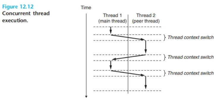 read나 sleep 같은 느린 시스템 콜을 실행하거나, 또는 시스템의 인터벌 타이머에 의해 인터럽트가 걸려서) 컨텍스트 스위치를 통해 피어 스레드로 제어권이 넘어갑니다. 피어 스레드가 잠시 실행되다가 다시 메인 스레드로 제어권이 넘어오는 식으로 반복됩니다.스레드 실행은 몇 가지 중요한 면에서 프로세스와 다릅니다.