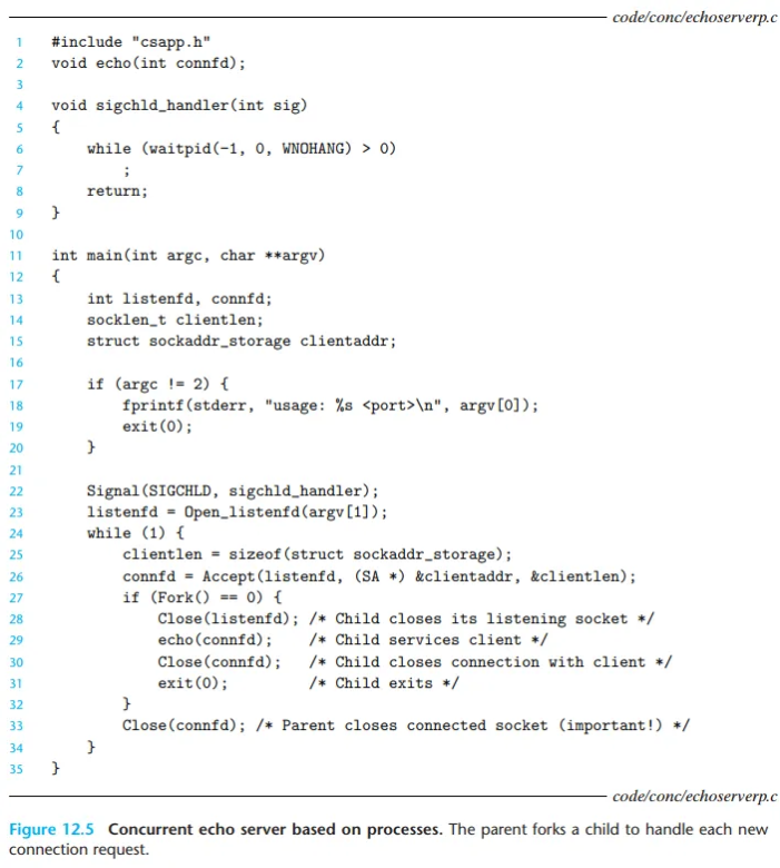 Figure 12.5는 프로세스를 기반으로 하는 동시성 에코 서버의 코드를 보여줍니다. (29행에서 호출되는 echo 함수는 Figure 11.22의 것입니다.)